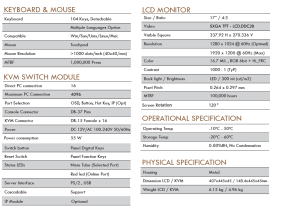 - Integrating a 17” LED screen, keyboard andmouse pad in a 1U rackmountable dual slidinghousing. The dual rail design console is ultilized for narrow space for short-rack mounting in condensed area. The AL-DV716L can control up