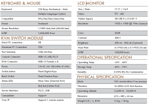 • LCD KVM console with an 17.3” LED-backlit 16:9 LCD monitor in a single rail design.