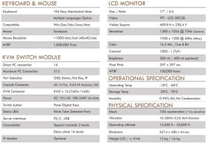 • LCD KVM console with an 17” TFT LED-backlit wide 5:4 LCD monitor in a single rail design.