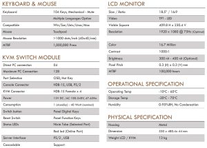 • LCD KVM console with an 18.5” LED-backlit 16:9 LCD monitor in a single rail design.